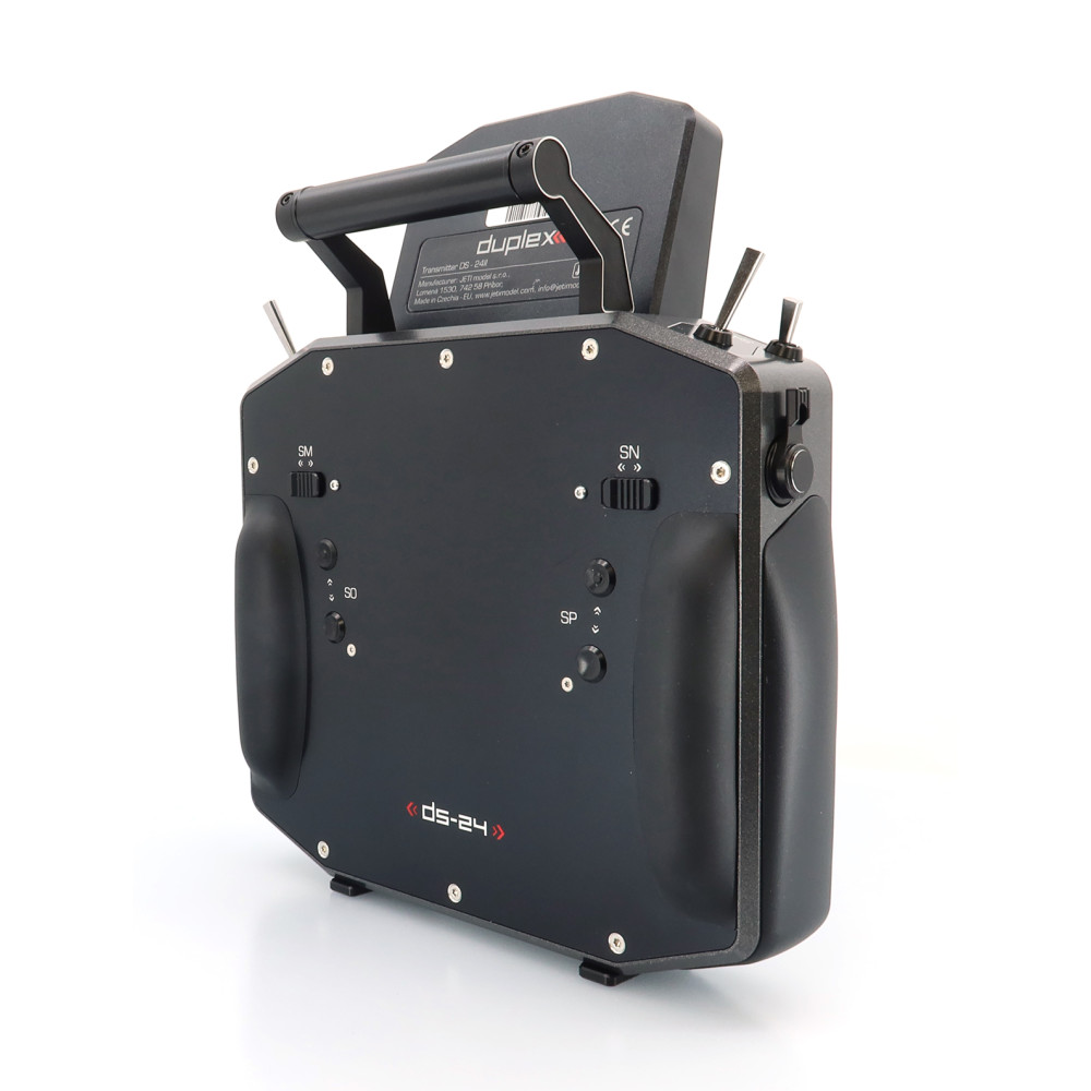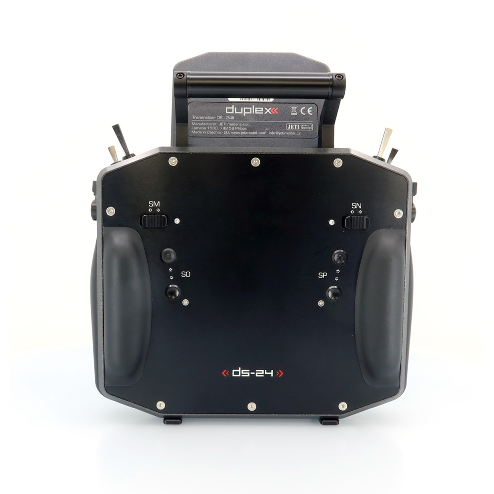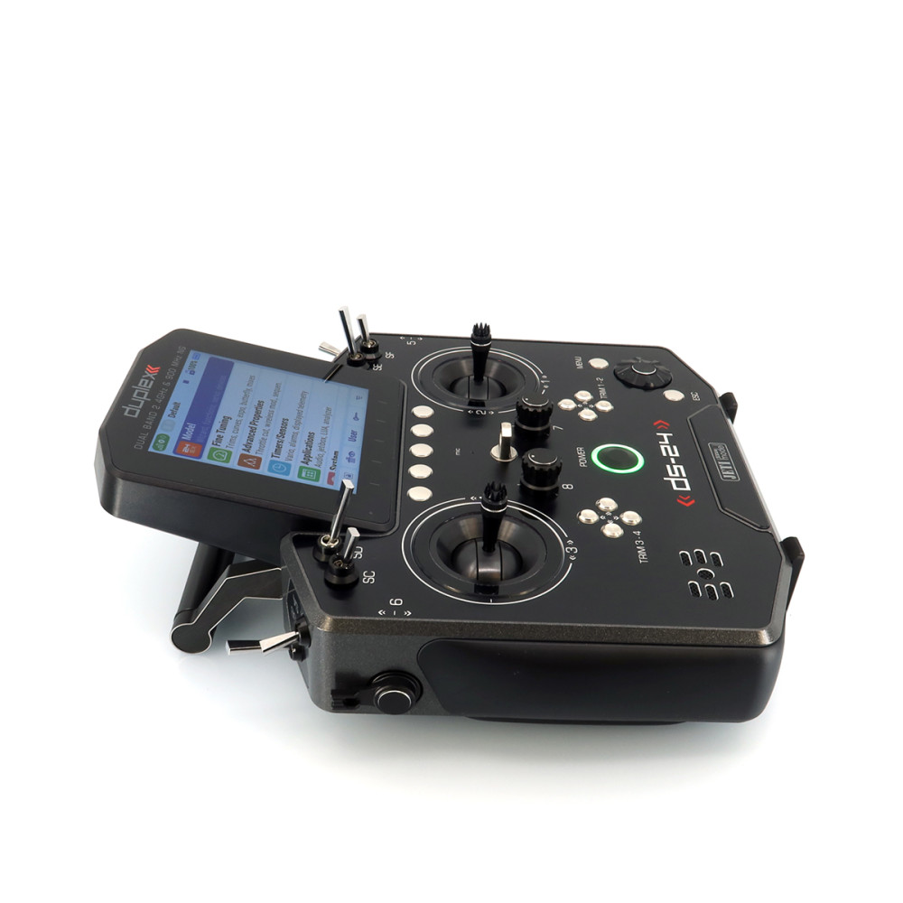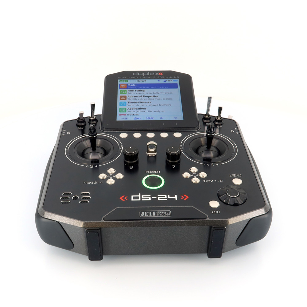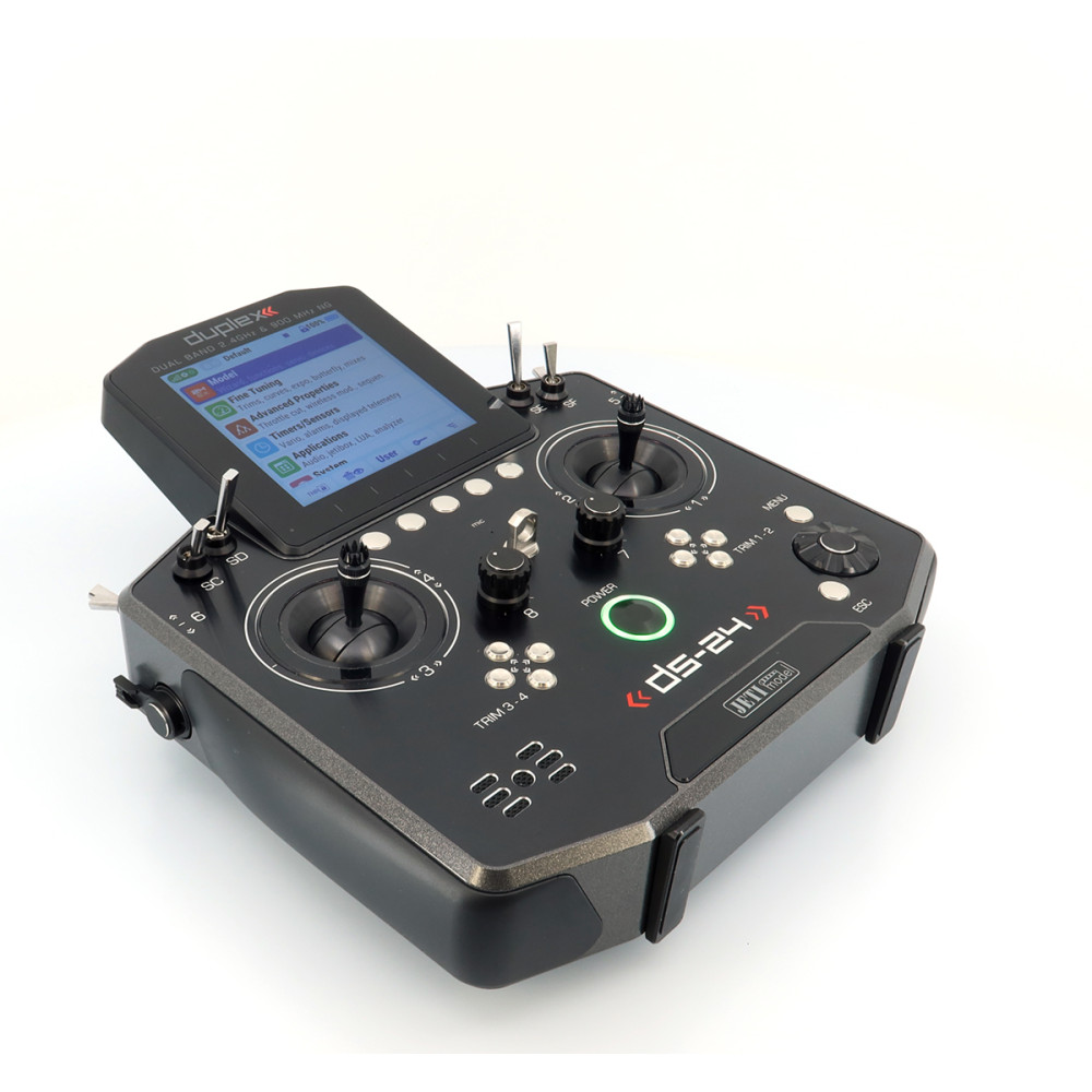Palcový (DS) vysielač JETI DUPLEX DS-24II druhej generácie prináša nadčasový dizajn s prepracovaným a ľahším rámom, nové grafické rozhranie JUi2, väčší a jasnejší 4" displej a výkonnejší hardvér pre plynulú prácu. Podporuje Bluetooth (vrátane bezdrôtových slúchadiel a online telemetrie cez smartfón), má Wi-Fi modul pre online aktualizácie, a USB-C na nabíjanie aj pripojenie k PC/Mac. Systém DUPLEX 2.4 GHz je plne kompatibilný s Duplex ekosystémom a súčasťou je aj záložný systém 900 MHz NG.