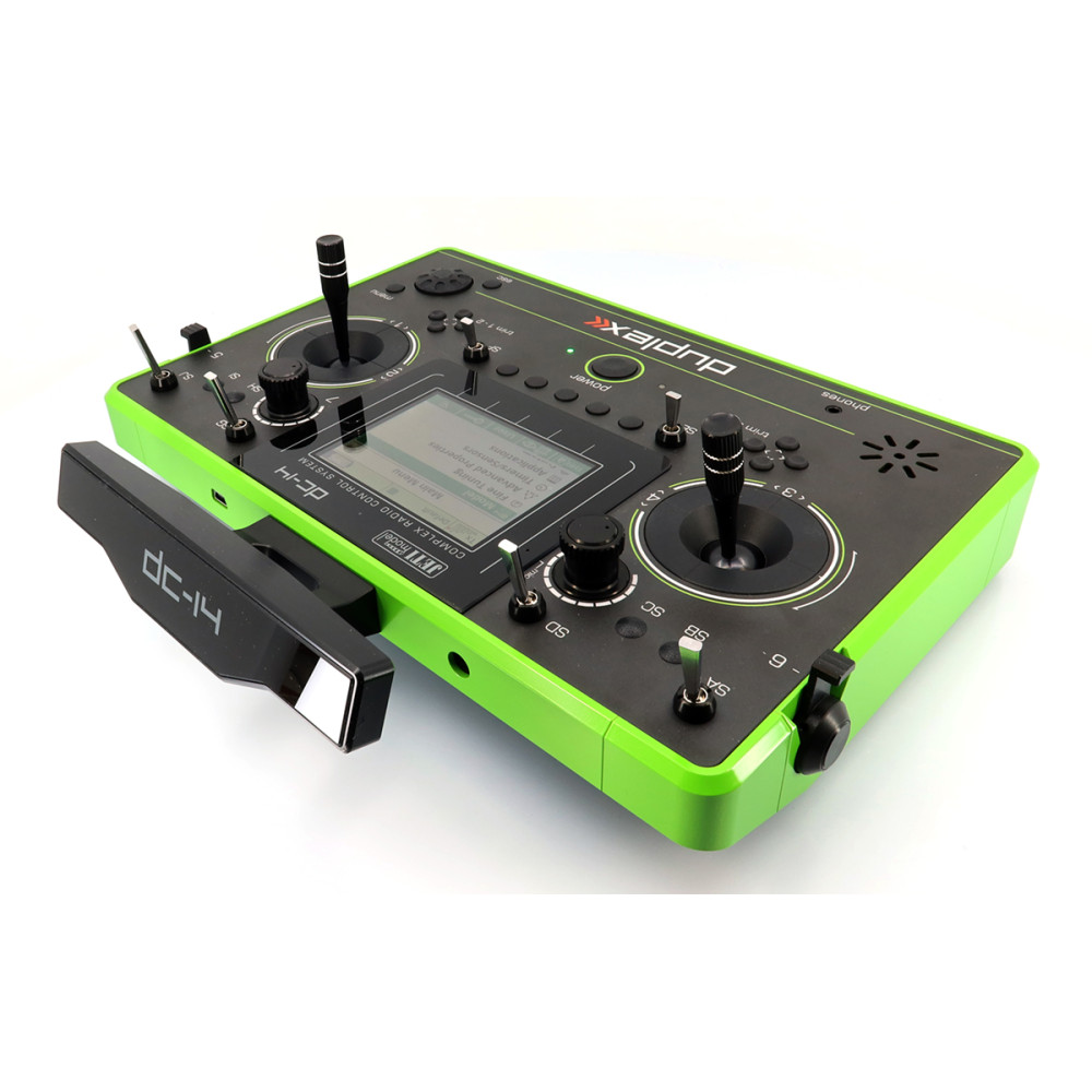 DC-14 II (Rev.2) prináša prehľadné používateľské rozhranie s pohodlným ovládaním pomocou rotačného ovládača a funkčných tlačidiel. Na hornej strane je farebný 3,5" TFT displej (320 × 240 px) s dobrým pozorovacím uhlom a čitateľnosťou, vhodný na zobrazenie telemetrie aj vo forme grafov (pri rozšírení). Vysielač podporuje zvukové upozornenia a alarmy, prehrávanie audia a má USB konektor pre pripojenie k počítaču, aktualizácie a prenos dát.